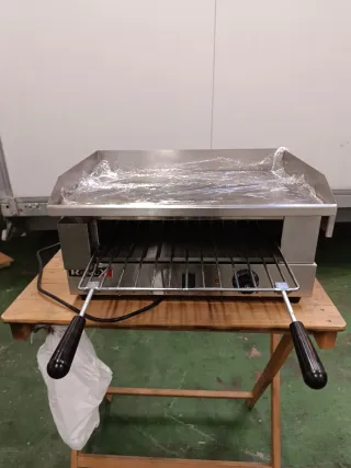 Plancha profesional de acero inoxidable con función gratinador. Ideal para hostelería. - Superficie de cocción lisa. - Construcción robusta en acero inoxidable. - Mandos de control de temperatura. - 2 en 1, plancha y salamandra - Diseño compacto y funcional