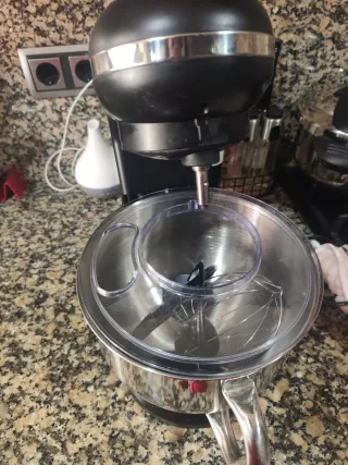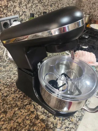 Batidora amasadora de la marca Ambiano en color negro. Cuenta con un bol de acero inoxidable y accesorios. - Diseño moderno y elegante. - Incluye varillas y gancho amasador. - Tapa protectora transparente - Potencia: 800 w -Velocidades: 6