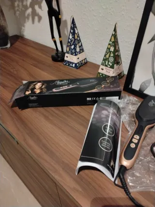 Cepillo alisador eléctrico con mango en color dorado y negro. Incluye instrucciones. - Diseño ergonómico. - Botones de control. - Cable de alimentación.