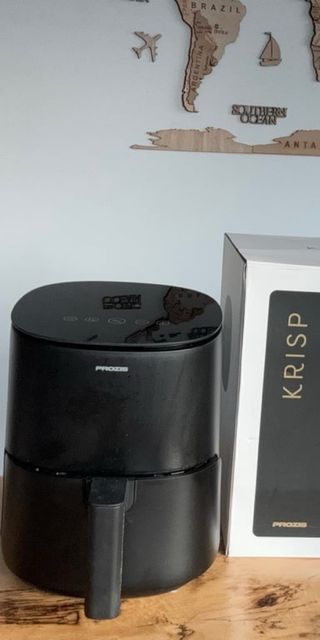 Freidora de aire en color negro marca KRISP, nueva a estrenar. Temperatura ajustable: 80-200 °C (incrementos de 5 °C) Temporizador integrado: 1-60 min (incrementos de 1 min) Voltaje: 220-240 V ~ 50-60 Hz Potencia: 1400 W Longitud del cable: 0,8 m Dimensiones: 281 (largo) x 230 (ancho) x 297 (alto) mm Peso: 3,4 kg Capacidad: 2,5 L 8 modos de cocción preconfigurados No necesita precalentamiento Apagado automático Protección contra sobrecalentamiento Bonito diseño, tamaño reducido