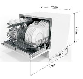 Lavavajillas de tamaño compacto, ideal para espacios reducidos. - Color blanco y panel superior beige. - Panel de control con selector y botón. - Mangueras de conexión incluidas.