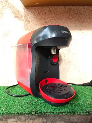 Cafetera de cápsulas Bosch en color rojo y negro. Un electrodoméstico compacto y moderno para preparar tu café. - Diseño elegante en rojo y negro. - Bandeja extraíble para tazas de diferentes tamaños.