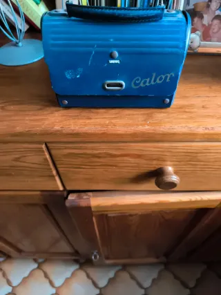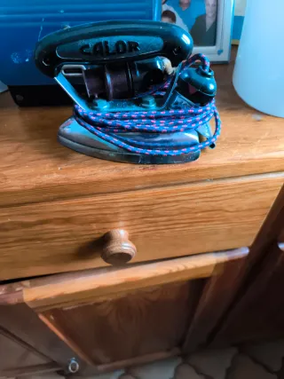 Plancha de viaje antigua de la marca Calor, ideal para coleccionistas. - Diseño compacto y portátil. - Color azul. - Asa superior negra.