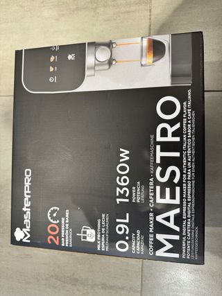 Cafetera digital MasterPro Maestro para un auténtico sabor a café italiano. Potencia de 1360W y capacidad de 0.9L. - 20 bares de presión. - Función de vapor para leche. - Diseño moderno y compacto. PRODUCTO COMPLETAMENTE NUEVO. A ESTRENAR.