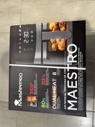 Freidora de aire MasterPro con tecnología Dual Heat y capacidad de 8 litros. Permite cocinar de forma más saludable y rápida. - 360° Hot Air Circulation. - 80% Less Oil Consumption. - 30% Faster than the oven. - Potencia: 2250W. - Multifunción: freír, asar, hornear y recalentar. COMPLETAMENTE NUEVO. A ESTRENAR.
