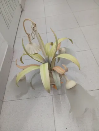 Lámpara de techo con un diseño inspirado en flores y hojas. Ideal para dar un toque decorativo a cualquier estancia. - Estructura metálica con acabado en tonos pastel. - Tres tulipas de cristal esmerilado. - Diseño floral con hojas en verde y toques anaranjados.