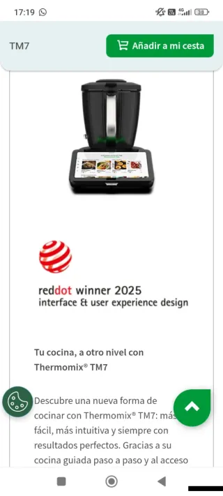 Robot de cocina Thermomix TM7, ganador del Red Dot Award 2025 en diseño de interfaz y experiencia de usuario. Lleva tu cocina a otro nivel con este avanzado electrodoméstico. - Diseño moderno y elegante. - Interfaz intuitiva para una experiencia de usuario mejorada. - Cocina guiada paso a paso.