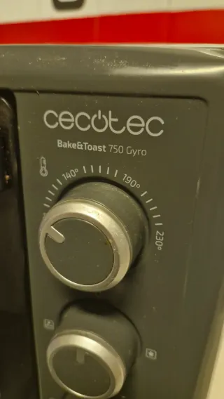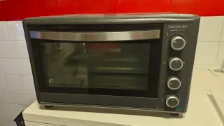 Horno eléctrico Cecotec con función grill. Ideal para preparar tus comidas favoritas. Ligero y portátil pero funciona como un horno grande. Funciona perfectamente. Lo he usado unas 4 o 5 veces al año y contento con su rendimiento. Se encuentra en perfecto estado. - Color gris oscuro. - Puerta de cristal con tirador metálico. - Mandos giratorios para temperatura, función y tiempo.