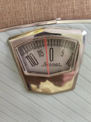 Báscula de baño antigua de la marca Bernar. - Diseño clásico con esfera analógica. - Marco metálico plateado. - Base con estampado de líneas.