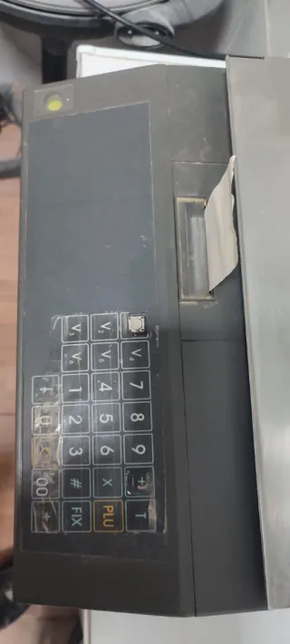 Antigua báscula comercial Magriña con teclado numérico. Ideal para negocios. - Incluye báscula y terminal de punto de venta (TPV). - La báscula tiene una superficie de acero inoxidable. - El TPV tiene un teclado numérico y una impresora de tickets. - Se encuentra en buen estado de conservación.