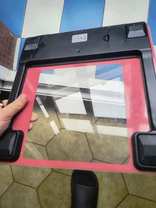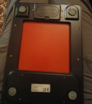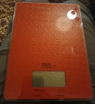 Báscula de baño digital con una superficie de color naranja. - Pantalla digital. - Indicador de peso máximo: 150kg. - Precisión: 100g. Le falta la tapa de la pila/ batería. Si eres mañoso se la puedes fabricar de plástico