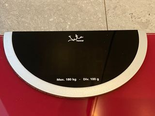 Báscula digital Jata para baño, en color rojo oscuro. Diseño actual y en perfecto estado de funcionamiento. - Capacidad máxima: 180 kg. - Precisión: 100 g.