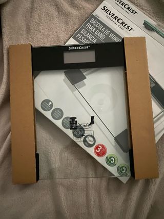 Báscula de baño Silvercrest, comprada en Lidl. Diseño moderno y elegante. - Superficie de cristal templado. - Pantalla digital LCD. - Diseño extraplano.