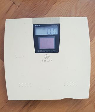 Báscula de baño solar. Es muy práctica porque no lleva pilas. Funciona en cuanto recibe un rayito de sol...La vendo por no usarla.