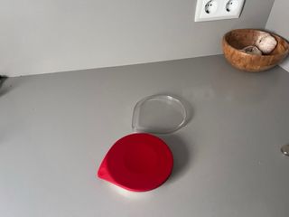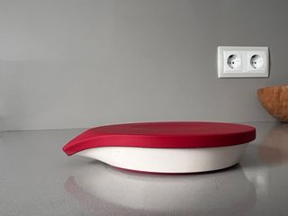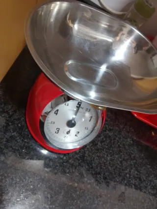 Báscula de cocina analógica de color rojo. - Plato superior. - Dial con medidas en gramos y kilogramos. - Capacidad máxima de 5000g.