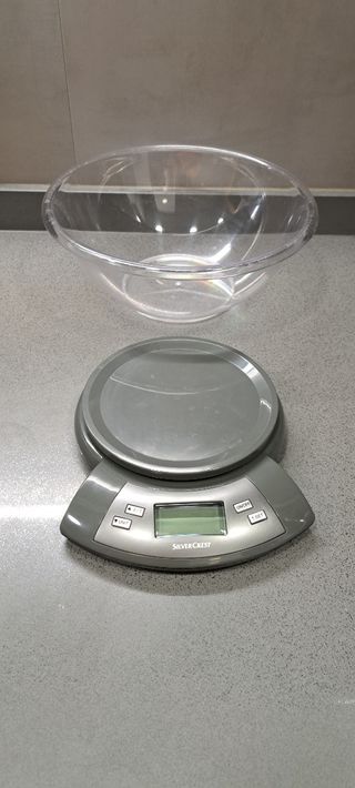 Báscula de cocina. Peso máximo 5kg. Marca LIDL. Funciona con pila de botón. No incluida