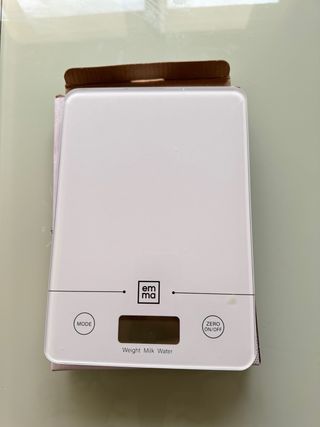 Báscula digital de cocina marca Emma con acabado blanco. Poco uso. - Superficie de vidrio. - Botones táctiles 'MODE' y 'ZERO ON/OFF'. - Pantalla digital para visualización de peso. - Indicaciones 'Weight Milk Water'.