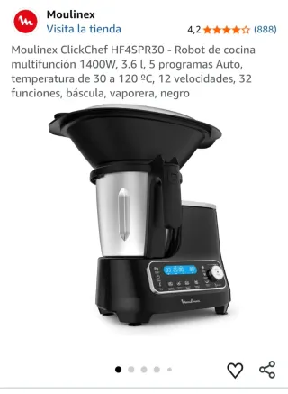 Robot de cocina Moulinex ClickChef en color negro, tipo Termomix. NUEVO AL 100% en su caja. Era un regalo de boda que al final no se pudo hacer y está por estrenar. Se podría entregar con ticket para tener 3 años de garantía. Es un electrodoméstico multifunción con gran capacidad. - Modelo: HF4SPR30 - Potencia: 1400W - Capacidad: 3.6 l - Programas: 5 Auto - Temperatura: 30 a 120 ºC - Velocidades: 12 - Funciones: 32 - Incluye báscula y vaporera.