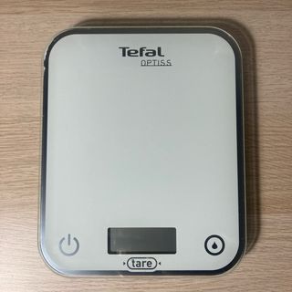 Báscula de cocina digital de la marca Tefal, modelo Optiss. Su diseño es moderno y funcional. - Superficie blanca. - Pantalla digital. - Botón de encendido/apagado. - Botón 'tare'.