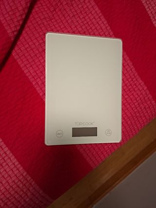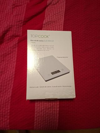 Báscula de cocina electrónica TopCook, nueva a estrenar. Es de color blanco y se ve en perfectas condiciones. - Báscula electrónica de cocina. - Incluye recipiente. - Alta precisión en la medición.