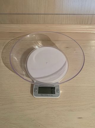 Báscula de cocina digital en buen estado. Es compacta y fácil de usar. - Diseño elegante y moderno. - Superficie lisa y limpia. - Se requieren 2 pilas AAA (no incluidas).