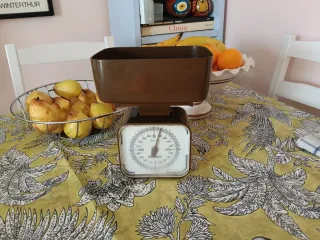 Báscula de cocina antigua, en color crema. Ideal para pesar ingredientes en la cocina. - Báscula de cocina de diseño clásico. - Color crema, en buen estado. - Incluye recipiente.