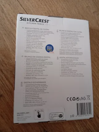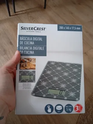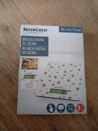 Báscula digital de cocina SilverCrest, ideal para medir ingredientes con precisión. Su diseño es moderno y funcional. - Capacidad máxima de 5 kg. - Pantalla digital clara. - Incluye pilas. - 3 años de garantía.