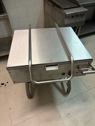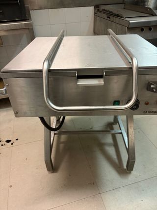 Sartén basculante eléctrica profesional con sistema de elevación automática. - Construcción robusta en acero inoxidable. - Panel de control intuitivo. - Diseño compacto para cocinas profesionales.