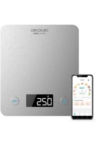 Cecotec Báscula de Cocina Cook Control 10000 Connected con App, Acabado en Acero INOX, precisión de 1 gr, Capacidad de 5 kg, Pantalla LCD, diseño extraplano, Recubrimiento antihuellas