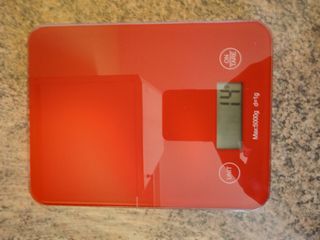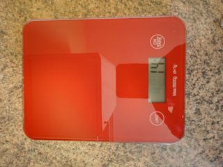 Báscula de cocina de color rojo. Es compacta y fácil de usar. - Capacidad máxima: 5000g - Precisión: 1g - Funciones: encendido/apagado y tara