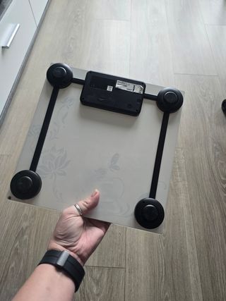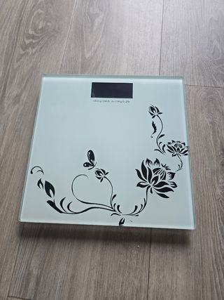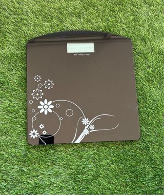 Báscula digital con superficie de cristal y un diseño floral. - Pantalla digital. - Diseño floral decorativo. - Funciona con una pila de boton. - Color negro con flores blancas. - Cristal La báscula está nueva , solo estuvo puesta como decoración .