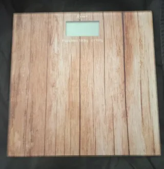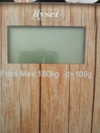 Báscula de baño con diseño de madera. Cuenta con una pantalla digital para una fácil lectura. - Peso máximo: 180kg. - Precisión: 100g.