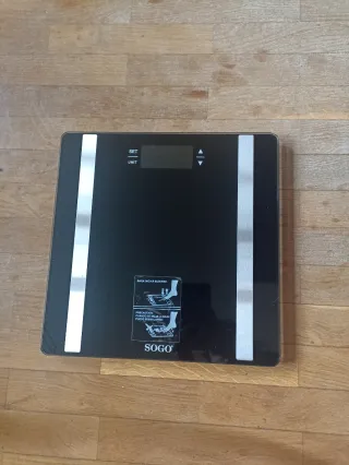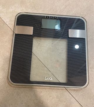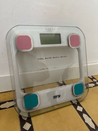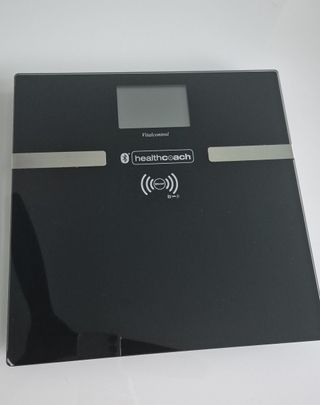 Báscula de análisis corporal Sanitas SBF70 con superficie de cristal. - Diseño moderno en cristal negro. - Pantalla digital integrada. - Conexión Bluetooth. Funciona con una app pero yo al cambiar de móvil no se guardaban los datos por el tipo de conectividad. Los datos los daba, pero no me los guardaba en la app. Se puede consultar el modelo y si sirve en vuestro móvil la app.
