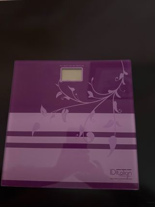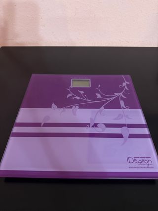 Báscula digital de diseño floral en tonos morados. Cuenta con una pantalla LCD para una fácil lectura. - Diseño moderno con motivos florales. - Superficie de cristal. - Base estable. - Está nueva nunca se ha usado