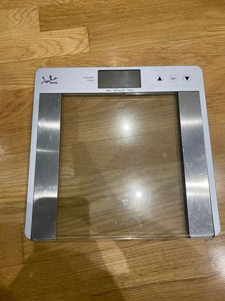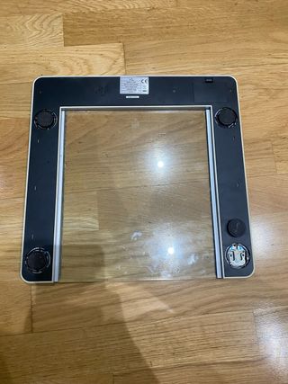 Báscula digital Jata Fitness con superficie de cristal y detalles metálicos. - Diseño moderno y elegante. - Indicador de máximo 150 kg. - Precisión de 100 g. Esta roto uno de los 4 soportes. se ve en la foto que esta del revés.