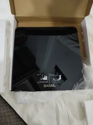 Báscula digital BAGAIIL con superficie de cristal negro. - Encendido automático. - Indicación de Slippery when wet (resbaladiza cuando está mojada). - Advertencia DON'T USE ON CARPET (no usar sobre alfombra).
