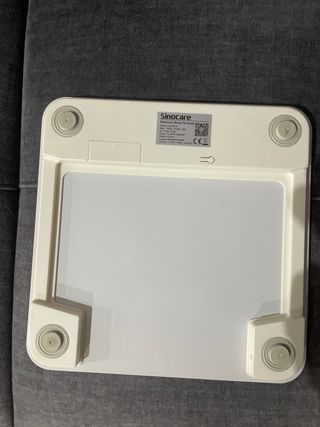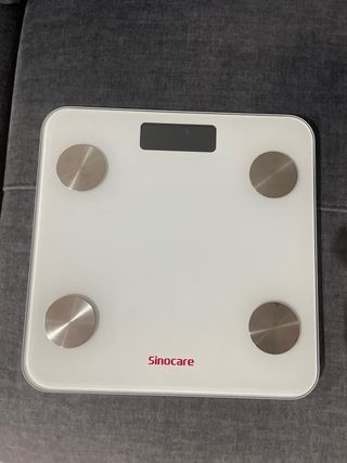 Báscula digital de la marca Sinocare con superficie de cristal. - Diseño moderno y minimalista. - Cuatro sensores de alta precisión. - Pantalla digital integrada.