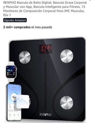 Báscula digital RENPHO para el hogar, con diseño moderno y pantalla LED. - Mide grasa corporal, masa muscular y más. - Conectividad a app para seguimiento. - Acabado en cristal negro.