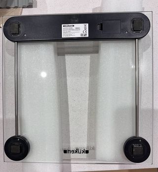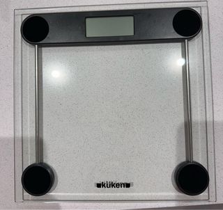Báscula digital de cristal con base antideslizante de la marca Küken. Funciona con pilas CR2032.
