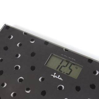Báscula digital Jata con un diseño moderno y elegante, ideal para tu hogar. Cuenta con una superficie de cristal templado y un estampado de lunares negros y blancos. - Diseño con lunares negros y blancos. - Superficie de cristal templado. - Pantalla digital LCD. - Indicador de batería baja. - Apagado automático.