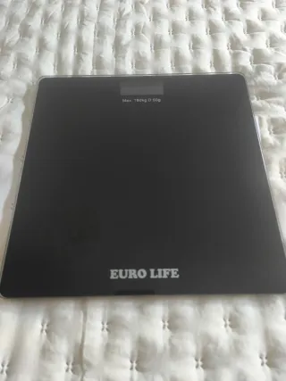 Báscula digital de diseño moderno y elegante. - Superficie de cristal templado. - Pantalla digital integrada. - Marca: EURO LIFE. - Capacidad máxima: 180 kg. - Precisión: 50 g.