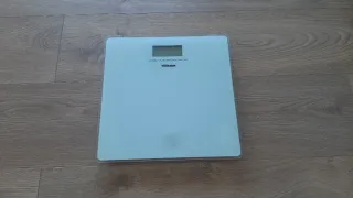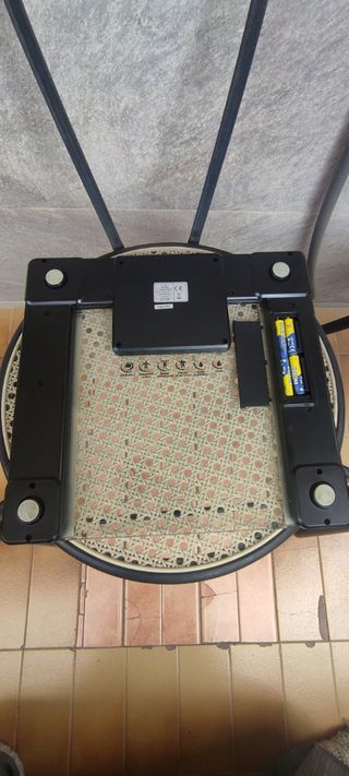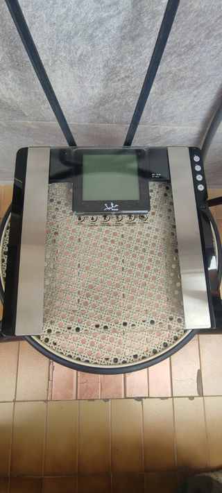 Báscula baño digital Jata de cristal y acero inoxidable. Marca varios datos como la grasa corporal, la masa muscular, y otros. Poco usada. Tiene algo de partículas de polvo del ambiente entre el visor y la superficie, que no le afectan en nada, pero no se pueden sacar. (Se ve en la foto de la pantalla)