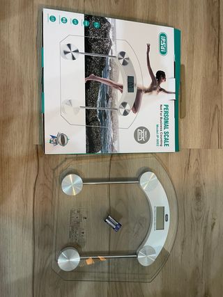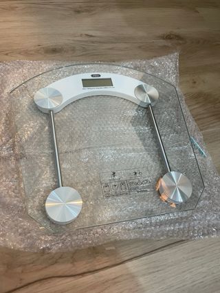 Báscula personal digital con diseño moderno y superficie de cristal. Es nueva a estrenar, compré dos por error. - Pantalla LED. - Capacidad máxima de 180 kg. - Incluye 2 pilas AAA.