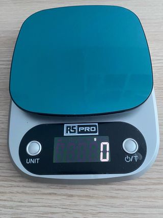 Báscula de precisión RS PRO en perfecto estado, con muy poco uso. - Diseño moderno con superficie de cristal. - Pantalla digital clara para lecturas precisas. - Botones de control para unidad y tara. - Capacidad de pesado 5kg, resolución 1 gramo