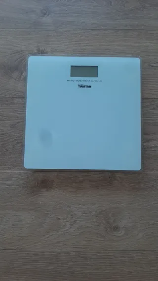 Báscula digital Tristar con superficie de cristal. - Diseño moderno y elegante. - Pantalla LCD para fácil lectura. - Capacidad máxima de 180 kg.