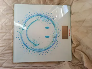 Báscula digital con un diseño moderno y alegre, decorada con un patrón de puntos azules y celestes que forman una cara sonriente. - Superficie de cristal. - Pantalla digital integrada. - Marca: SOHENLE.