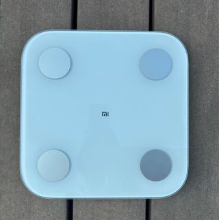 Báscula digital blanca de la marca Xiaomi. Diseño moderno y minimalista. - Superficie lisa y fácil de limpiar. - Cuatro sensores antideslizantes en la base.