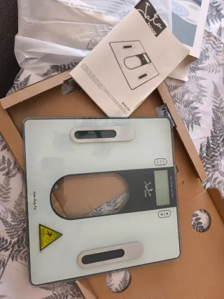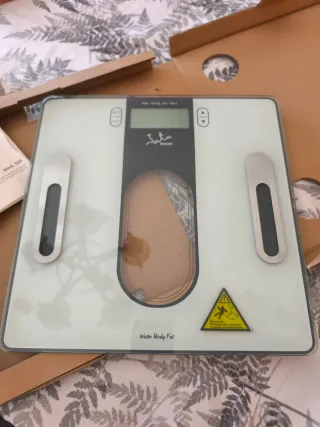 Báscula digital Jata para medir el peso corporal y la grasa. En perfecto estado, poco uso. - Diseño moderno con superficie de cristal. - Pantalla digital para fácil lectura con memoria. - Indicador de Water Body Fat. Se entrega en caja de una báscula Xiaomi, por aprovechar el embalaje, pero el artículo es una báscula de Jata.