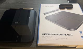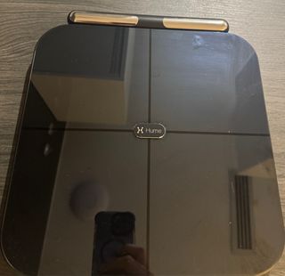 Báscula inteligente Hume con diseño moderno y superficie de cristal. - Medición avanzada de composición corporal incluyendo % de grasa corporal por zonas - Mide mas de 45 metricas de salud (peso, IMC, grasa corporal, grasa muscular, masa magra...) - Superficie de cristal negro. - Incluye soporte para colgar la barra medidora de grasa corporal - en ocasiones no sincroniza pero se soluciona reseteando la bascula - embalaje original - 1 mes de uso