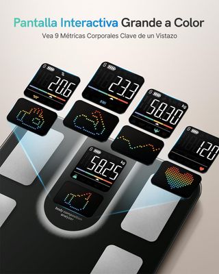 Análisis Profesional de 20 Datos de Salud No te conformes con las 13 métricas estándar. Esta báscula utiliza tecnología BIA avanzada para medir 20 indicadores clave: peso, % de grasa corporal, IMC, masa muscular, agua, grasa visceral, masa ósea, BMR, edad corporal y más. La bascula grasa corporal y muscular definitiva para un control total de tu evolución física. Pantalla Color HD de Gran Formato Olvida las pantallas convencionales; esta báscula cuenta con una pantalla a color de alta definición que permite visualizar tus resultados y la curva de tendencias directamente en el equipo, sin necesidad de consultar el móvil .